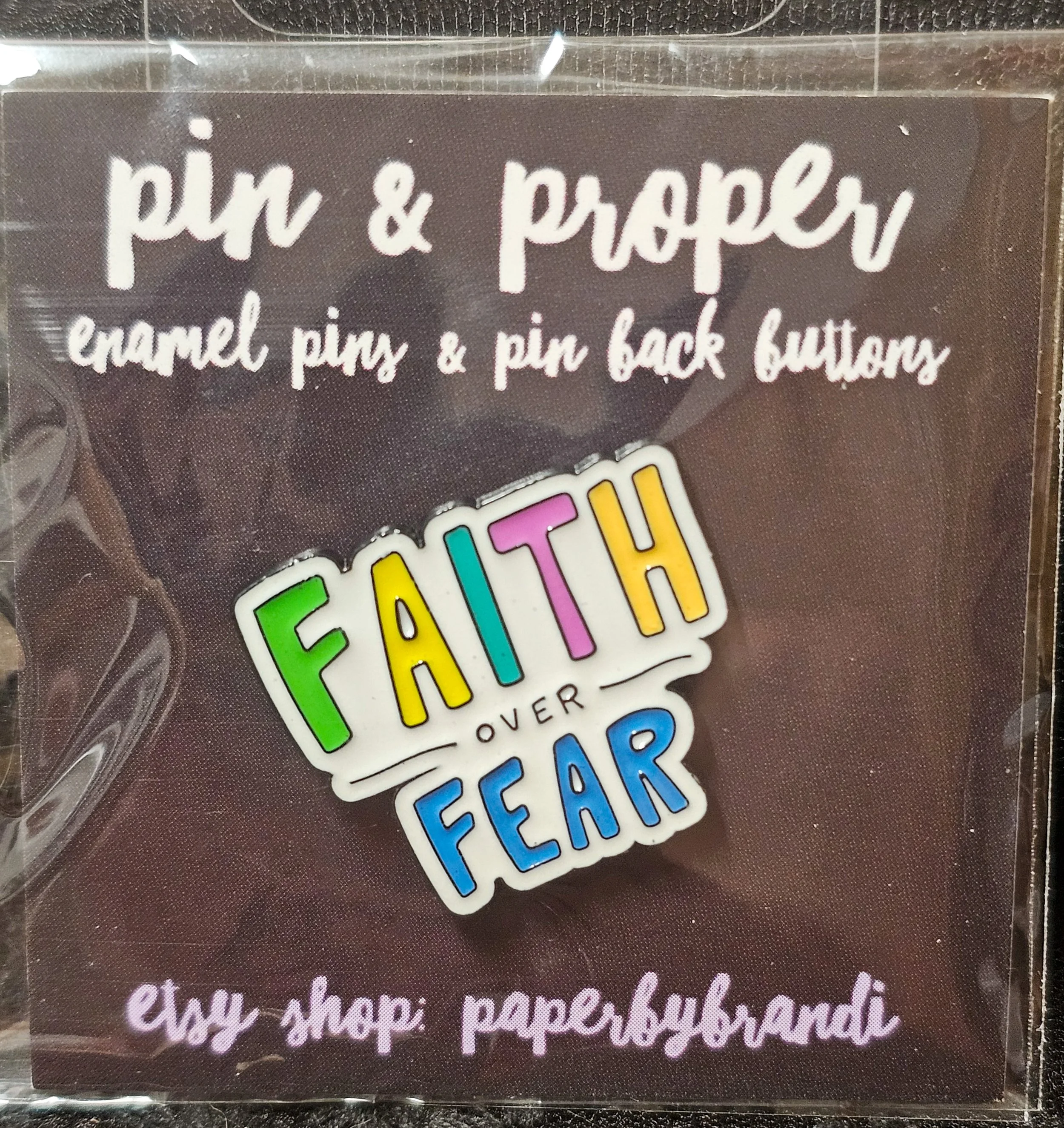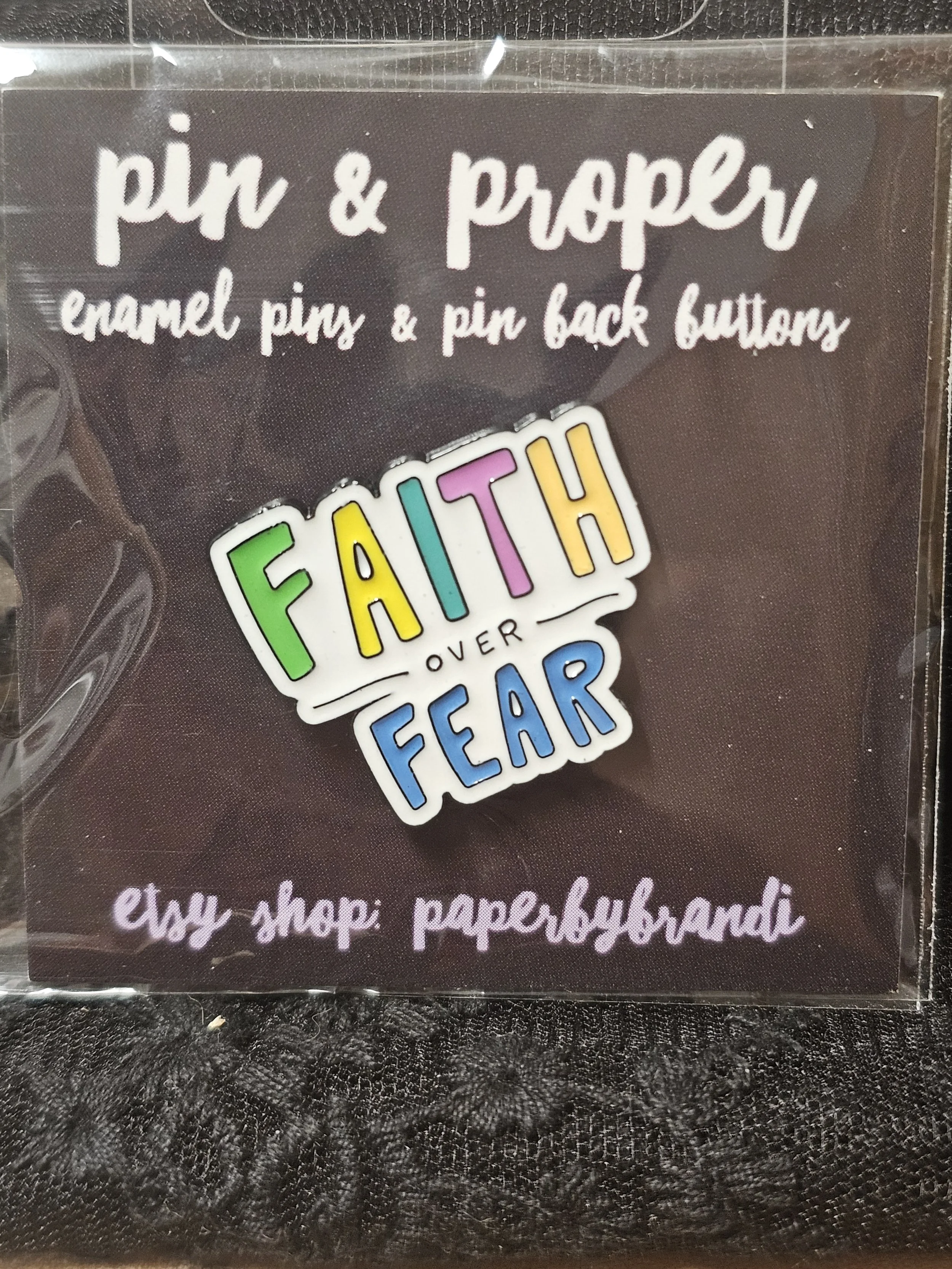 This bright, high-quality enamel pin is perfect for hats, clothing, backpacks and more. Rock your Faith Over Fear pin from pin and proper with pride!